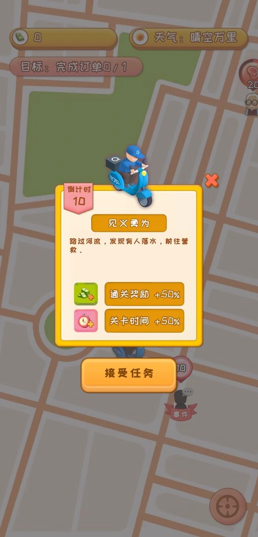 1、模拟外卖小哥送餐时遇到的各种真实情况,每一关都有不同的送餐时间及路线。