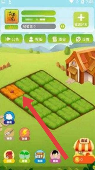 1. 点击农田里箭头所指的土地,开启种植流程,若仓库中有种子,可从中挑选并播种作物。