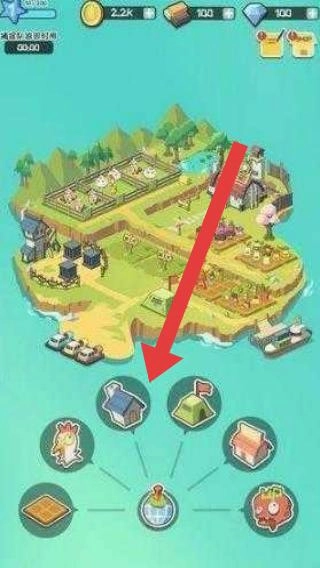 3、在岛屿界面,点击箭头指向的建筑图标,建设新设施(如房屋、工坊),拓展农场经营内容。