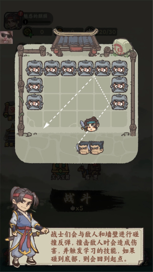 2、战士们会与敌人和墙壁进行碰撞反弹,撞击敌人时会造成伤害,触发学习技能。碰到底部则会回到起点。