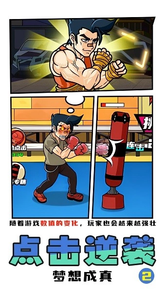 这是一款休闲解压的小游戏,玩家通过持续点击屏幕击打沙袋,就能提升自身的身体素质与各项身体指标。此外,还能挑战身份不明的对手,战胜他们获取奖励,逐步朝着拳王的荣誉迈进!