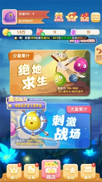 3、提供竞技、生存、决斗等多种模式,让你尽情体验水果乱斗的精彩对决。