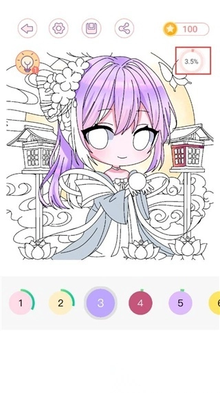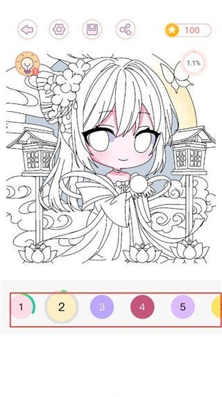 6、点击箭头符号就能返回,第三个按钮可以保存当前的涂色进度,第四个按钮则能把作品分享给你的小伙伴。
