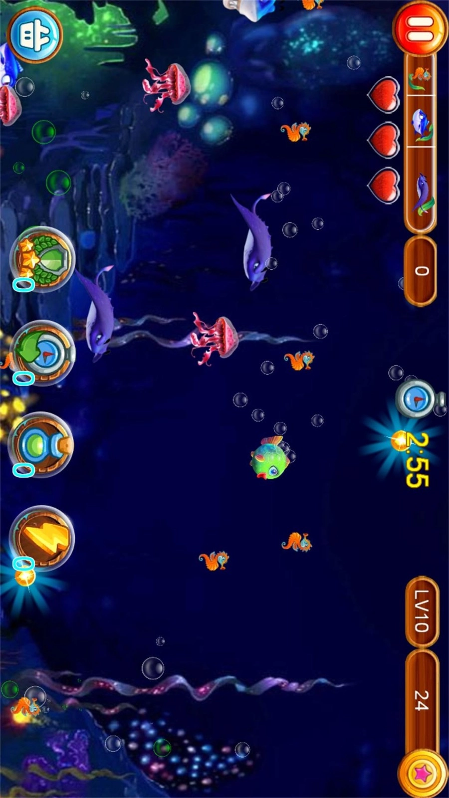 游戏音乐优美动听,各种音效也不错。你在游戏中可以听到气泡的咕噜咕噜的声音,还有海浪的声音,哗啦哗啦,来一起在游戏中体验海底的感觉吧。