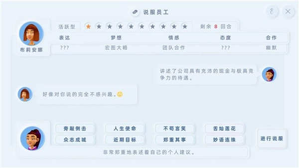 4、游戏的精髓所在,根据员工的能力、天赋和技能,把合适的员工放到合适的岗位,才能充分的发挥独特的能力,员工的配合还会触发团队突破效果,获取更多创新的内容,相当的有趣。