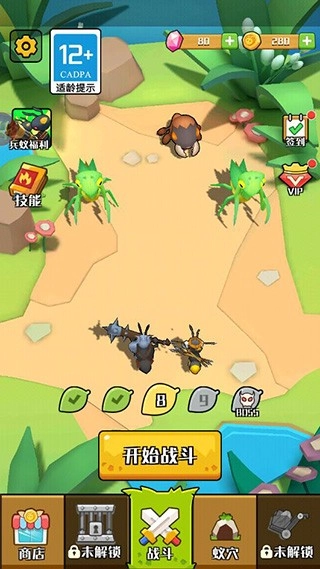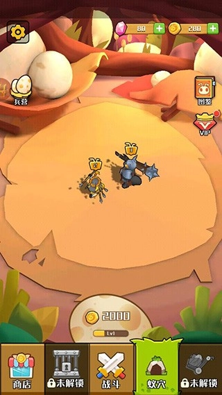1、极具吸引力的孵化合成玩法,可解锁超30种蚂蚁外观,购买蚁蛋即可孵化出兵蚁;通过简单的合成操作,能快速提升蚂蚁等级,使其生命、攻击、防御属性大幅增强,战斗时的输出能力也会变得更强劲。