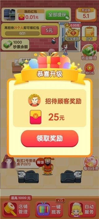 3、离线挂机直接开启放置经营,只要保证店员充足就不会影响到整体收益和口碑评价,每天上线都能直接领取资金财富。