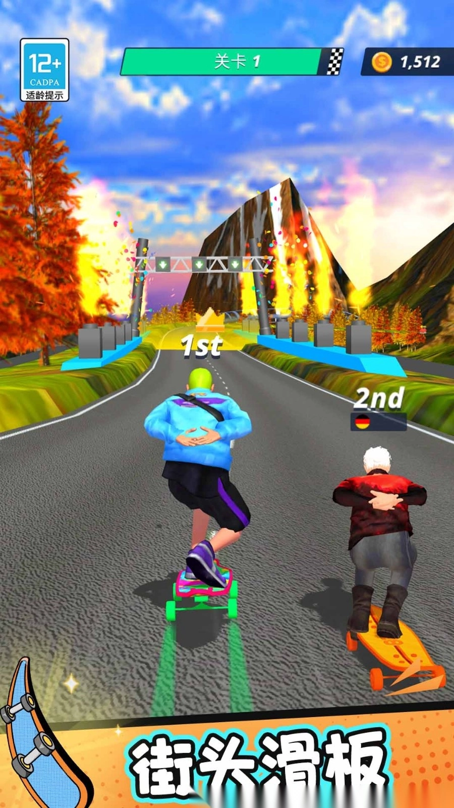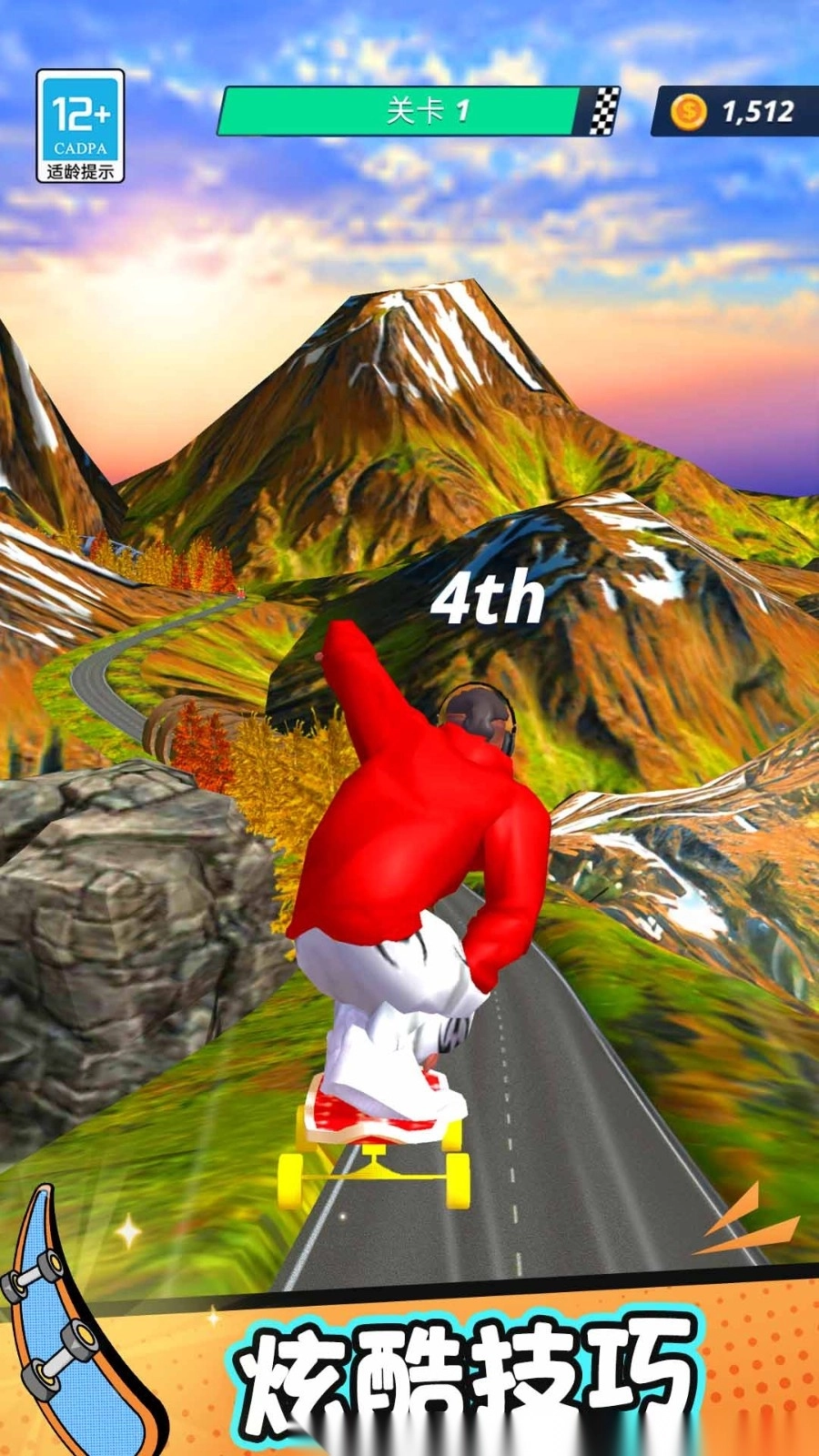 3.玩家在极速滑板时都有各自的炫酷特色技能,需要不断的进行闯关,来获得更高的分数,就能够解锁更多的关卡。