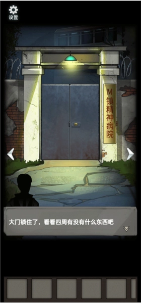 2、你将跟随着剧情进行畅玩,刚来到一家精神病院的门口,但门是锁住的,你需要找找钥匙;