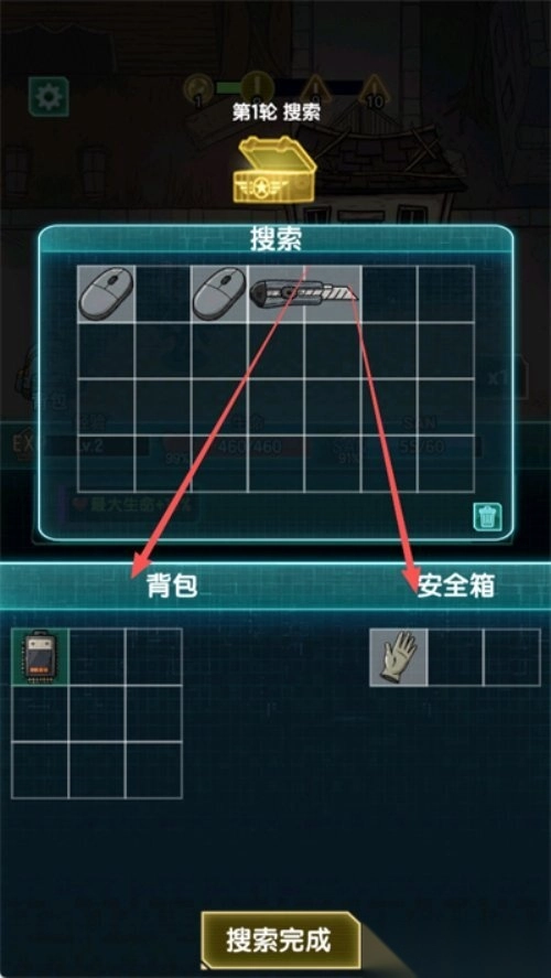 5. 搜索完成后你可以将物品放置下方的背包和安全箱中,安全箱中的物品死亡不会掉落,背包中的物品死亡会掉落。
