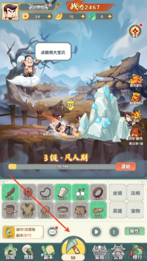 1. 启动游戏后,找到“铁镐”的图标并点击,用它敲击矿山来获取装备。