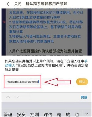 4、转移之前首先需要玩家确认转移的注意事项,确认完毕后将相应的确认术语填写进去点击后面的确认;
