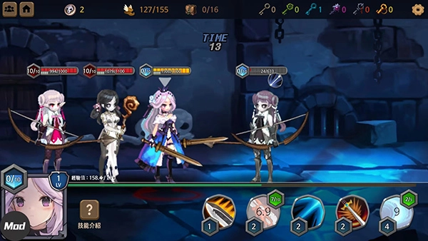 7、进入战斗界面,点击不同的角色可以选择不同的技能进行释放和攻击敌人,释放完成后会有一定的冷却时间,需要合理搭配技能使用,