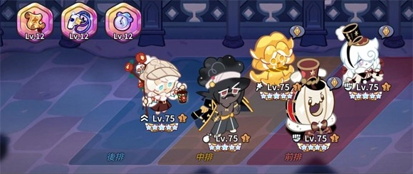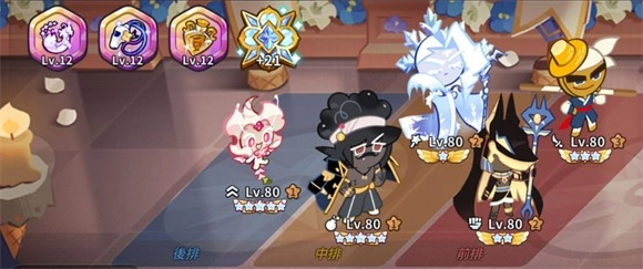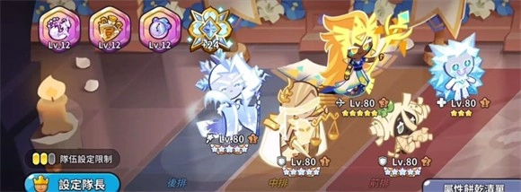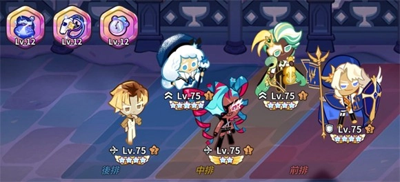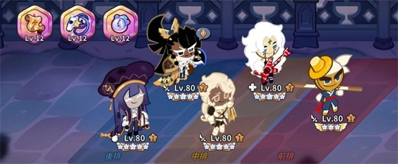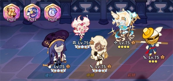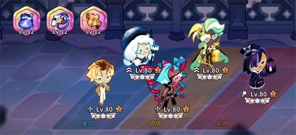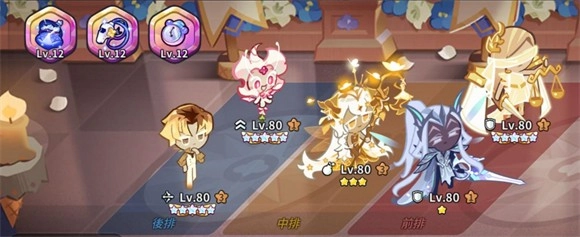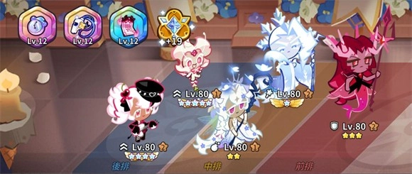6、角色方面前期先先选择能凑成一队的五个饼干,集中资源把它们拉到80级,然后放到神殿。