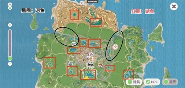 蓝色标注为河、湖、海洋,钓鱼爱好的图鉴解锁需要到对应的位置,心动小镇的钓鱼要求【地理位置(河、湖、海洋or开船进行的海钓事件)】+【天气】+【时间】,解锁时要找准位置和机会哦。