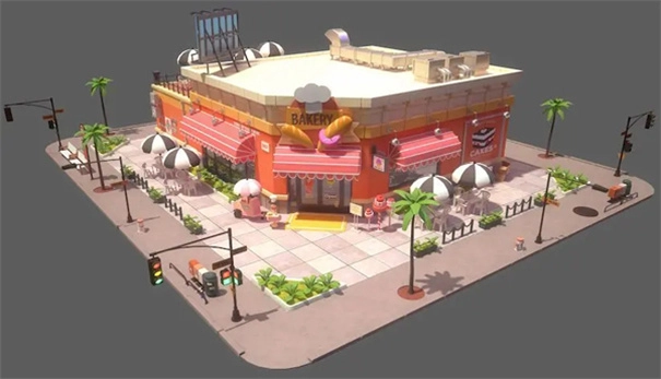 整体设计:位置应该坐落与城市中央,双层楼设计,烘培店周围铺设不知名石砖。