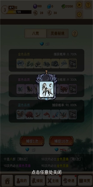 2、玩家们点击捕捉即可前往游戏内的地图中进行捕捉灵兽,游戏里有着超多的灵兽可以捕捉,每一个灵兽都有属于自己的技能和故事背景特色,十分帅气;