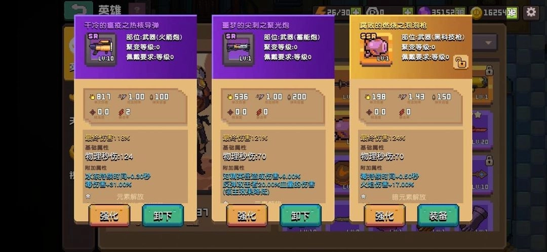 武器可以通过强化提升等级,通过升级解锁更高等级上限,通过聚变提升最终伤害。通过洗炼系统,勇士们还可以提升或更改词条属性。