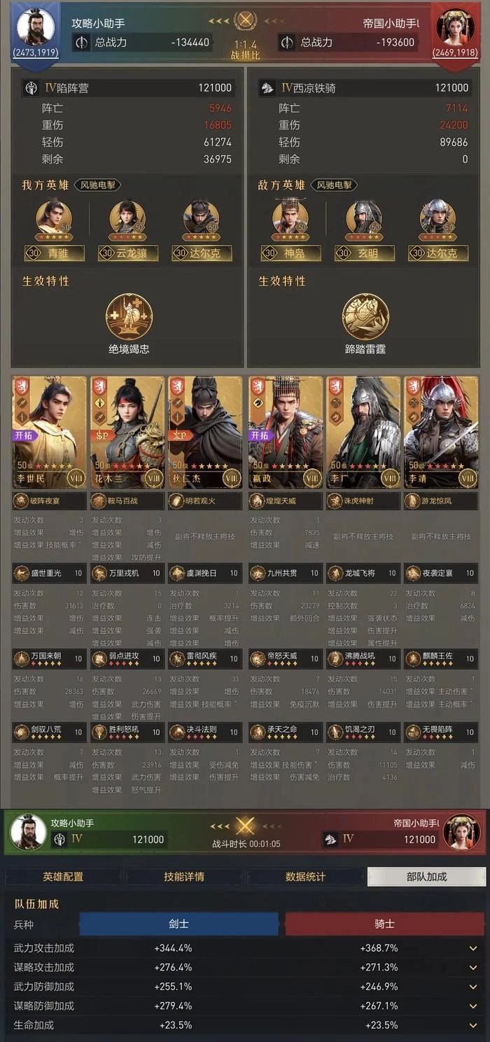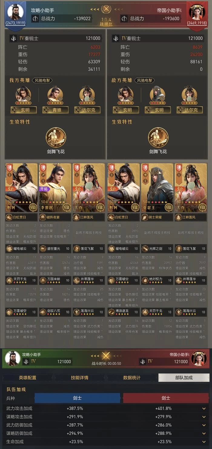 根据战报可见,李世民的主将技发动速度要略快于对手,也因此,张良固有技能的触发频次有所提升。再加上李世民本身的输出、减伤等效果,在不影响原张良剑坦度的情况下,进一步体现出了双核阵容带来的优势。