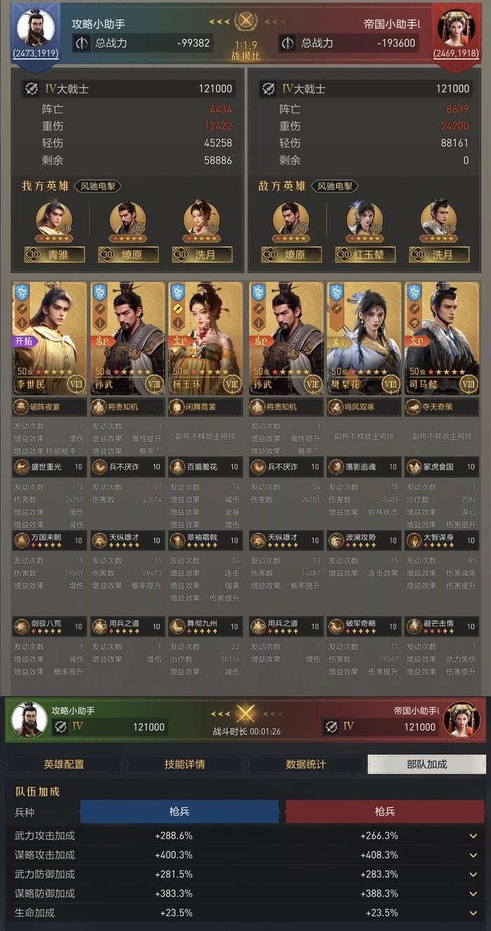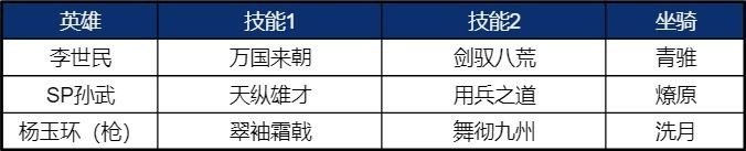 ◆ 李世民孙武枪/剑:多类型固有技能混搭阵容,搭配杨玉环坦度十分优秀,并且谋略龙息和孙武主将技都带有属性压制,实战中的功能性也不错。