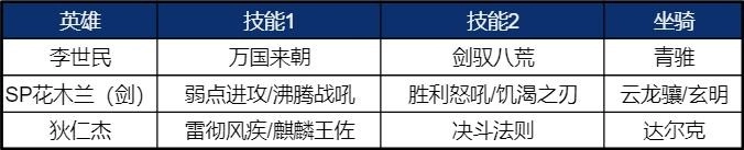 SP花木兰携带胜利怒吼,可以加速李世民的主将技释放,同时李世民再带动花木兰的主将技,给阵容提供额外的减伤。该阵容组合,在剑枪两用的基础上,花木兰还能使用双主动技能,配合狄仁杰的被动效果,使整体的回复、坦度更高。