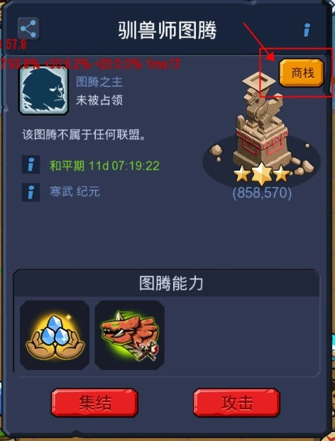 点击地图上任意一个图腾,将会出现图腾对话框,右上角有“商栈”按钮。