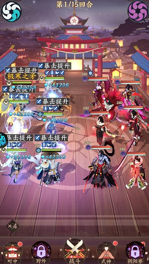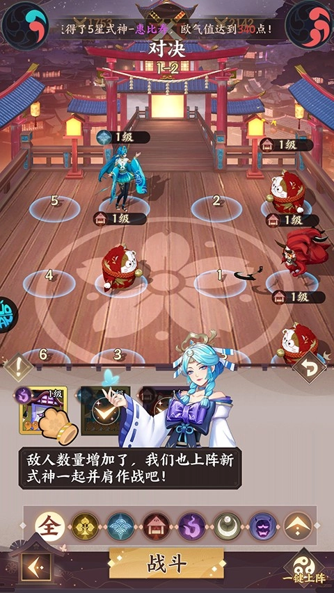 4、玩家想要快速结束战斗就需要将获得的式神进行升级养成、穿戴装备等,提高式神战斗力。
