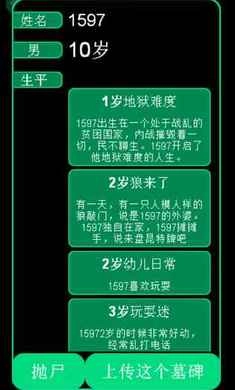 这是一个有关人生的游戏,玩家可以创建自己的角色,在这个逗比的社会中经历一生。死后还可以将自己的坟墓与朋友分享。游戏内事件会根据角色的选择发生改变,一些事件也会随机发生。事件全靠玩家贡献,你也可以将你的想法,提交给作者,写进游戏中。