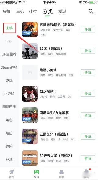 2、选择下方标注位置的主机游戏,进入主机游戏专区