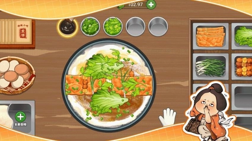 在游戏中你可以制作各种不同的美食,包括了煎饼果子、烤肉卷饼等等。