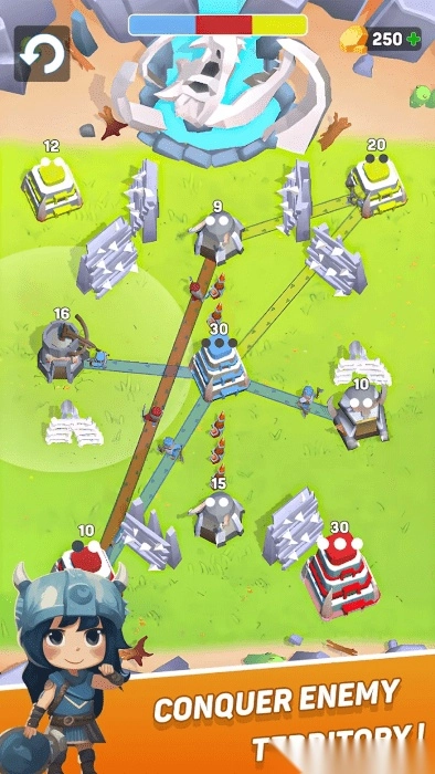 1、每一个决定都可能改变战斗的进程。指挥您的蓝色军队,对红色和橙色塔楼发动快速攻击,一次一场胜利扩大您的帝国。