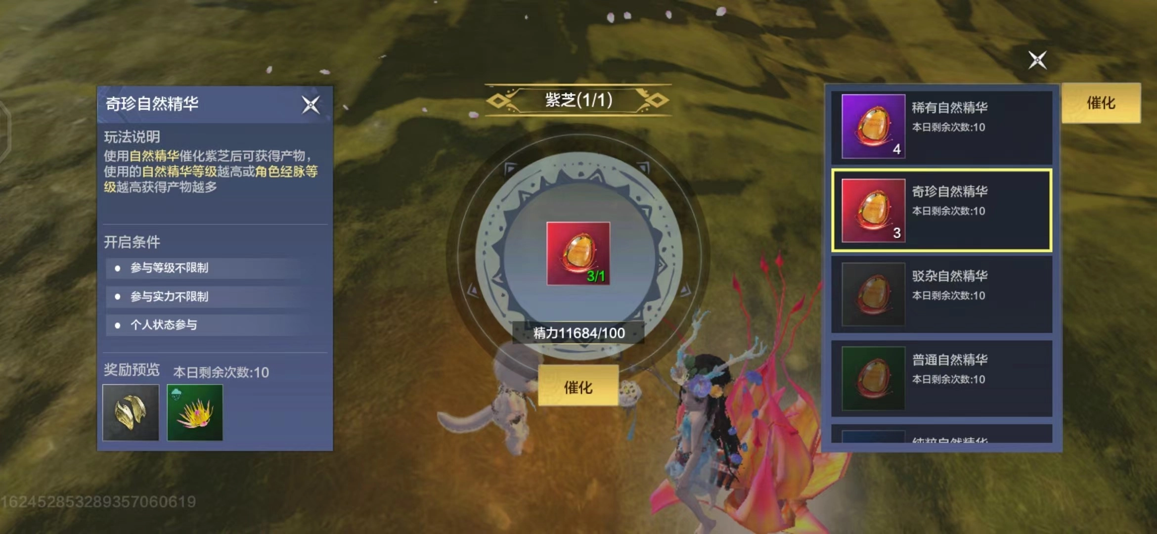 神草催化:前往北山地区寻找神草,使用自然精华可以催化紫芝神草获取灵气。(北山地区异兽较为强大,萌新可以组队前往~)