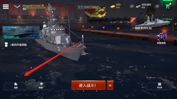 1、进入游戏主页后,点击左下方的“战舰”按钮即可打开商店,具体位置可参照下图所示;