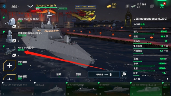 3、部分战舰购买不但需要花费货币,且有着等级要求,但可以开启更多等多的武器与玩法,如下图所示战舰,玩家购买后就可以尝试驾驶ah64阿帕奇战斗机进行战斗。