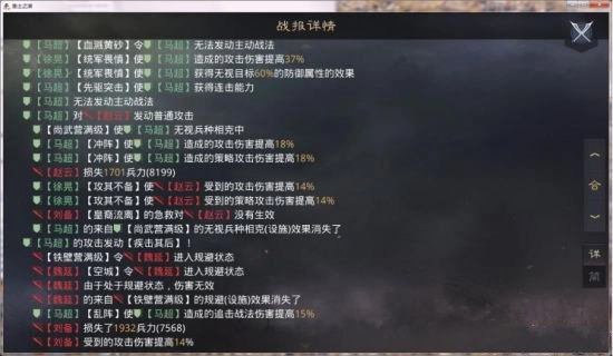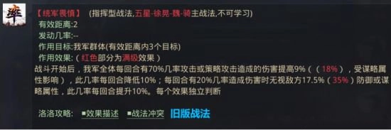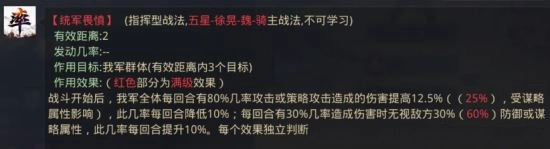 2、【统军畏慎】有两个效果,一是增伤,初始几率为80%,此几率越来越低;二是无视防御(谋略)属性,初始几率为30%,此几率越来越高。