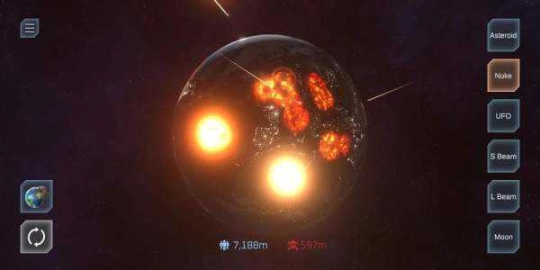 星球毁灭模拟器正版主要玩法还是将星球摧毁,你可以使用各种武器,包括导弹攻击、陨石撞击和 反物质炸弹等12种不同的毁灭性武器,超多的武器可以灵活使用,老少皆宜的操作方式,趣味的解压玩法。快来完成你的毁灭计划吧!