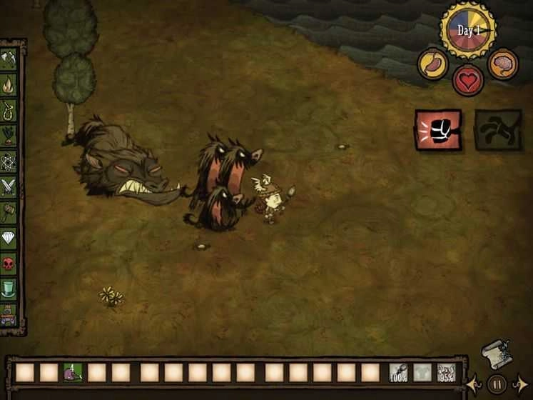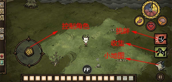 6、游戏就正式开始了,左边是控制角色方向的,右边是收集的,玩家需要收集一切能被利用的资源来躲避饥荒;