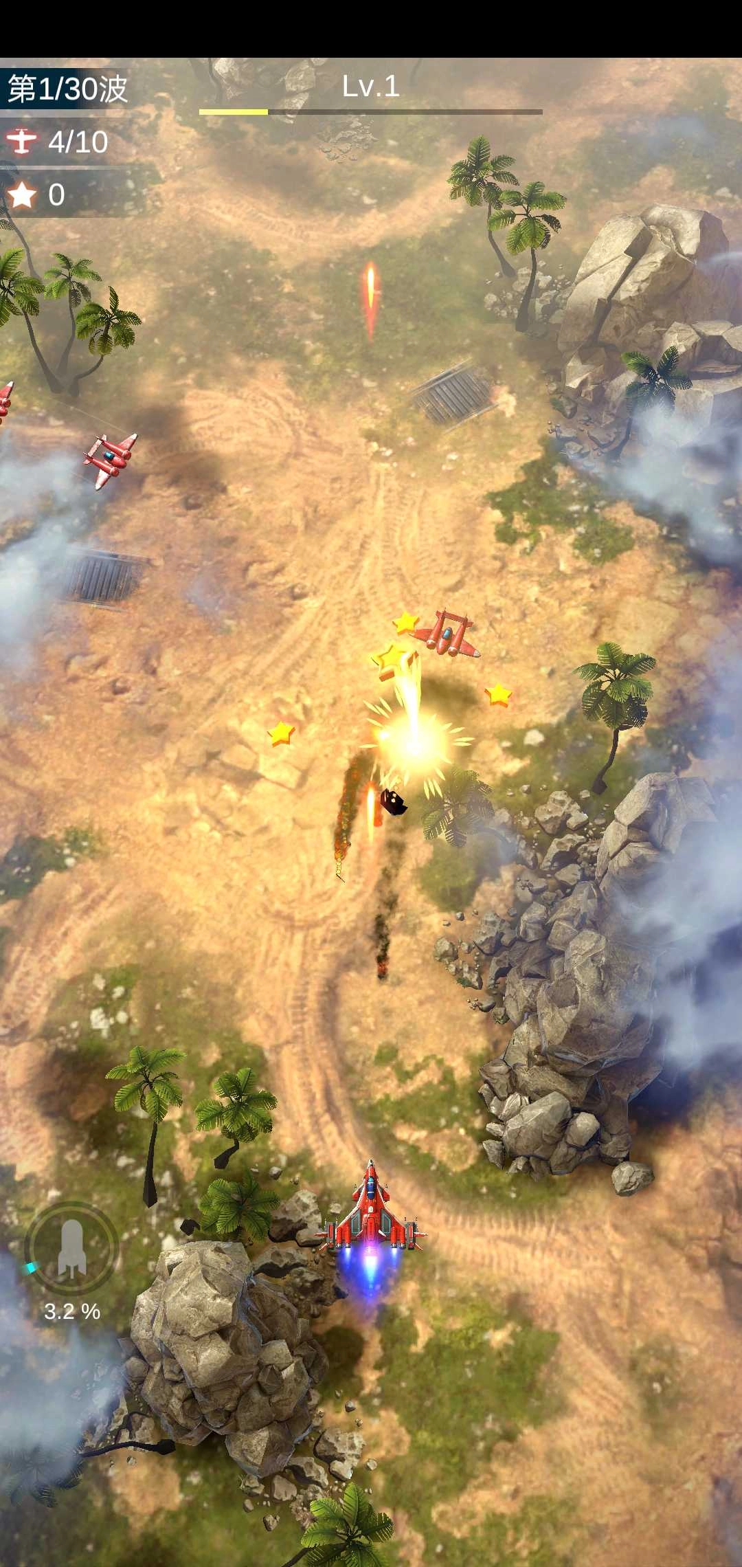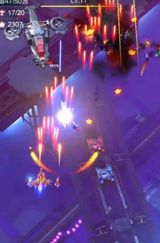 3、玩家在战斗过程中,玩家要操控战机左闪右避,注意走位来躲避敌方战机的弹幕攻击。