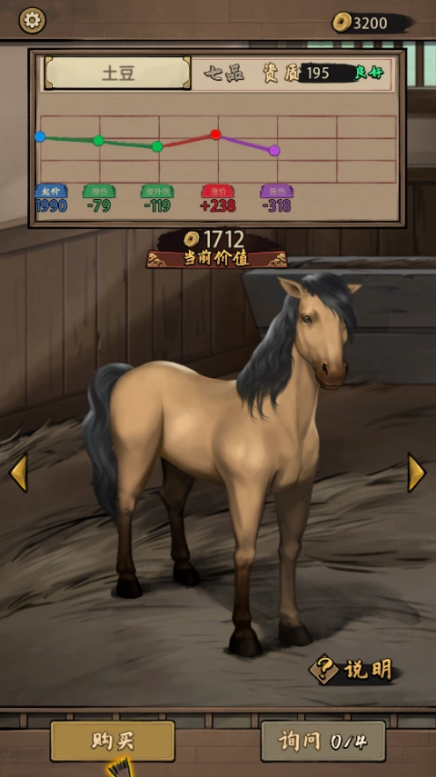 1、在本站中文的游戏打开进入开始游戏,新手一进入游戏就会有3200的金币可免费使用,可直接选一匹性价比高,速度快的马,这里我直接看中了名叫土豆的马。