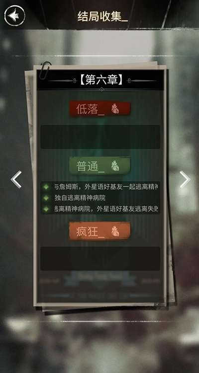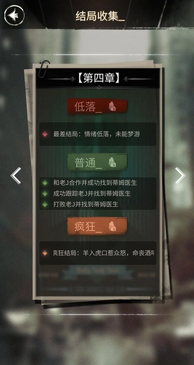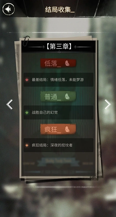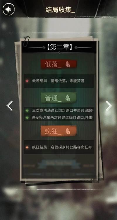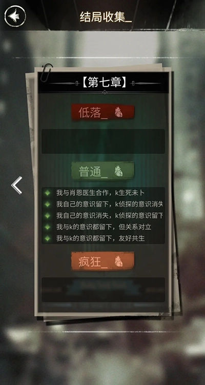 探魇作为一款文字剧情解谜游戏,拥有多元化开放结局,玩家会扮演侦探K,解读剧情文字,做出自己的判断,游戏的玩法非常烧脑,形式新颖,是很值得玩的侦探破案游戏。但游戏里总共有多少个结局呢?那就由小编给大家一一介绍吧!游戏里每个章节的结局根据情绪值来划分的话是共有三种:低落、普通、疯狂。而这三种结局又有不同的开放结局。