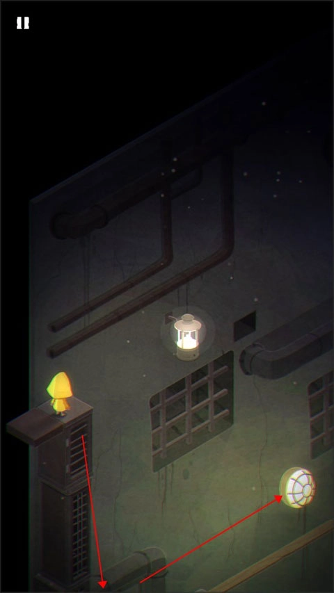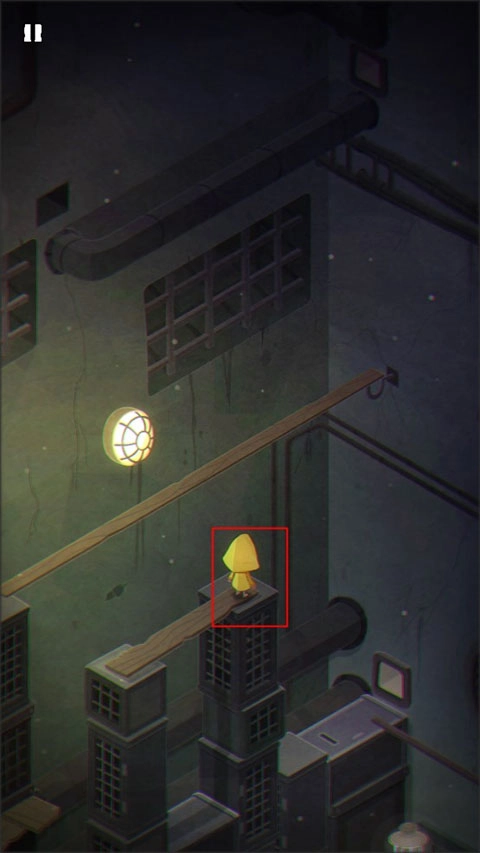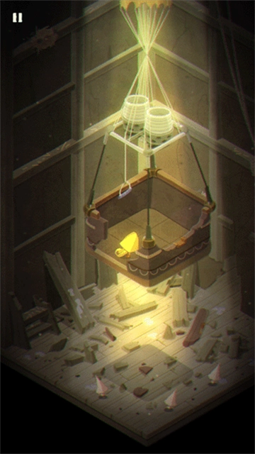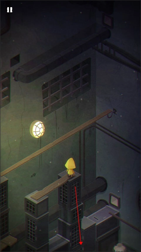 1、游戏的开始就是摩诺用门抵挡外面的攻击,第一关,摩诺在一个类似篮子的地方,需要按住上面的拉杆让自己落到地面上。