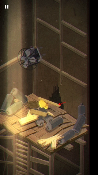 6、摩诺躲过桶,向楼梯往上爬,用力将这两块木板搬掉,就可以进入到下一个关卡了。