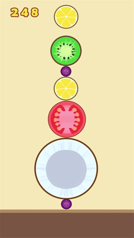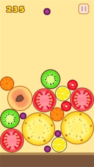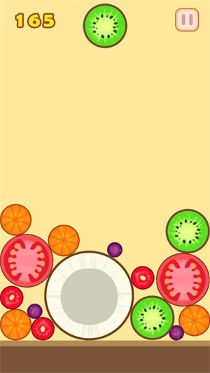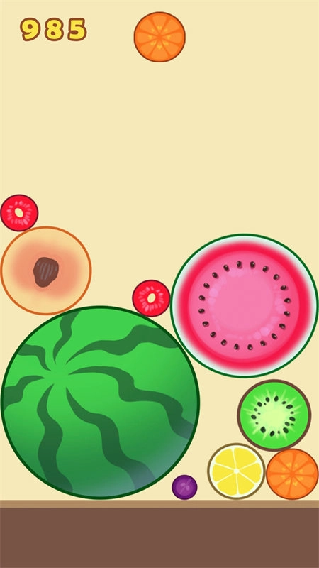 2、一开始玩建议大家有序的排列水果,遵从一个角落水果最大,越往外水果越小的感觉(类似2048),这样容易产生连续合成而节约空间。而且一旦大水果在中间很容易堆太高导致游戏失败。