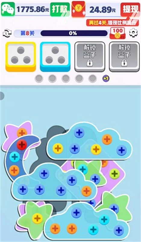 《起个螺丝》的玩法真的特别简单,玩家只要把关卡里的螺丝全部拆下来,就能满足通关要求,红包奖励会直接到账。另外消除螺丝时还能使用道具,这些道具效果特别棒,能帮玩家节省不少闯关时间。