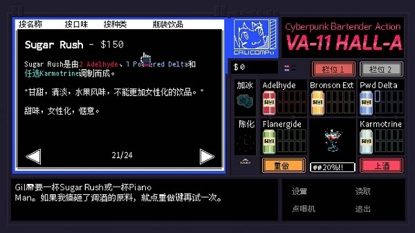 你是VA-11的酒保,我们亲切地称呼它为瓦尔哈拉,尽管它是一家很普通的酒吧,但它能把最具吸引力的乌托邦人都给吸引过来。