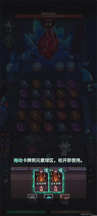 2、游戏的玩法就是卡牌+三消,玩家可以拖动卡牌到元素球区,松开使用;