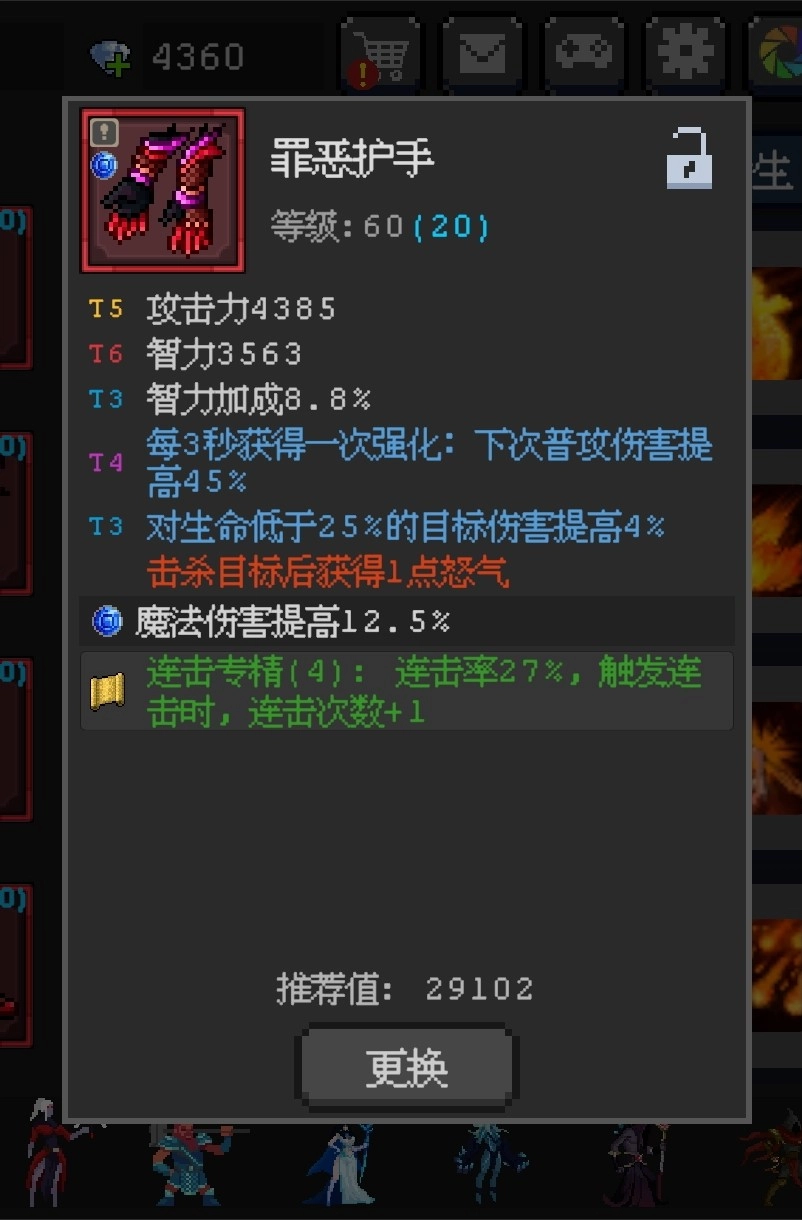 装备方面我是用罪恶套因为其本身前三个属性都是为法师装备的。钱够多最好刷T4以上,套装我是选择连击率4+烈焰4(流血辅助带项链,中毒我是辅C毒夫人)词条目前优先刷3秒+普攻伤害。因为零氪另一条没条件挑,真要选就选各种控制词条吧!