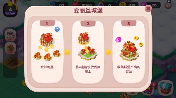 城堡可以通过升级城堡获取丰厚的产出物资(种子、金币等),同一类型的建筑物品都能用来升级城堡,随着物品等级越高,提供给城堡的升级经验也会越多,直到城堡升至满星。