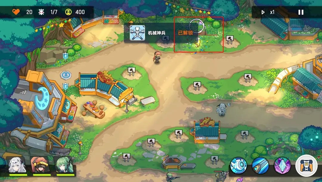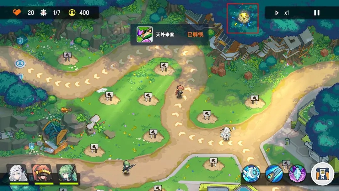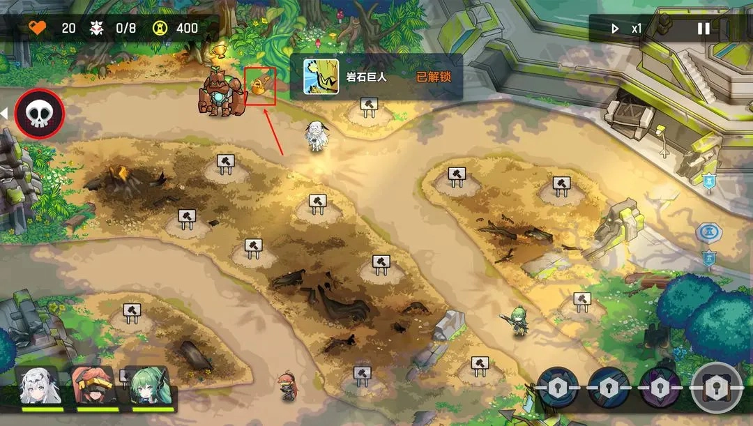 4、第三波怪的时候上路建一个攻击塔,之前如果激光塔,就建炮塔,如果是炮塔就建激光塔,然后在两个攻击塔后面建一个防御塔,把英雄挪到下路慢慢清怪,基本还可以在下路建一个攻击塔,这样轻松过关