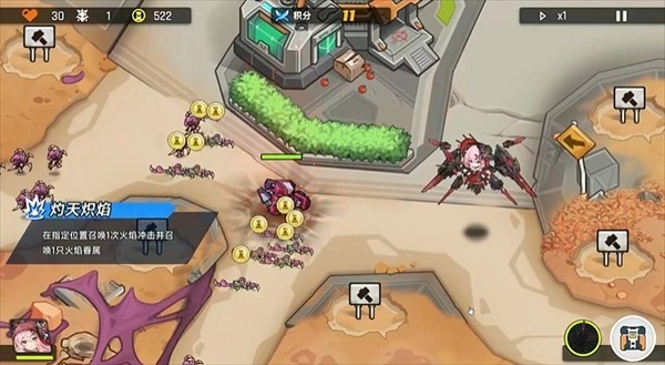 3、第二波怪的时候,上路激光塔和炮塔随便建一个,也升到两级,尽量建前面,英雄一起守,活用技能,怪太多又比较集中的时候,英雄技能可以带走大波